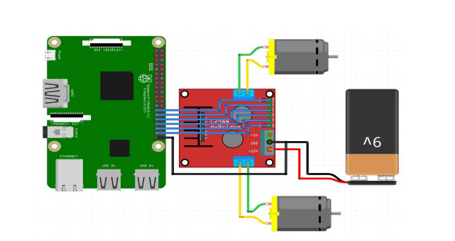 위 사진은 메인보드와 모터드라이버 그리고 모터의 회로도인데, 모터드라이버는 모터의 제어를 위해 추가 전력이 필요하다. 모델은 L298N을 사용하였고, 9V 전지로 작동시켰다.
