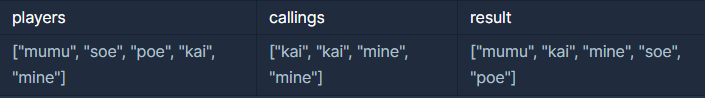선수들의 이름이 1등부터 현재 등수 순서대로 담긴 문자열 배열 players와 해설진이 부른 이름을 담은 문자열 배열 callings가 매개변수로 주어질 때, 경주가 끝났을 때 선수들의 이름을 1등부터 등수 순서대로 배열에 담아 return 하는 solution 함수를 완성해주세요.